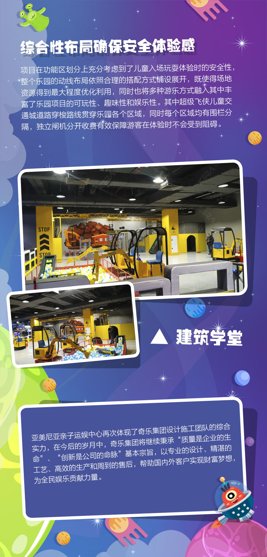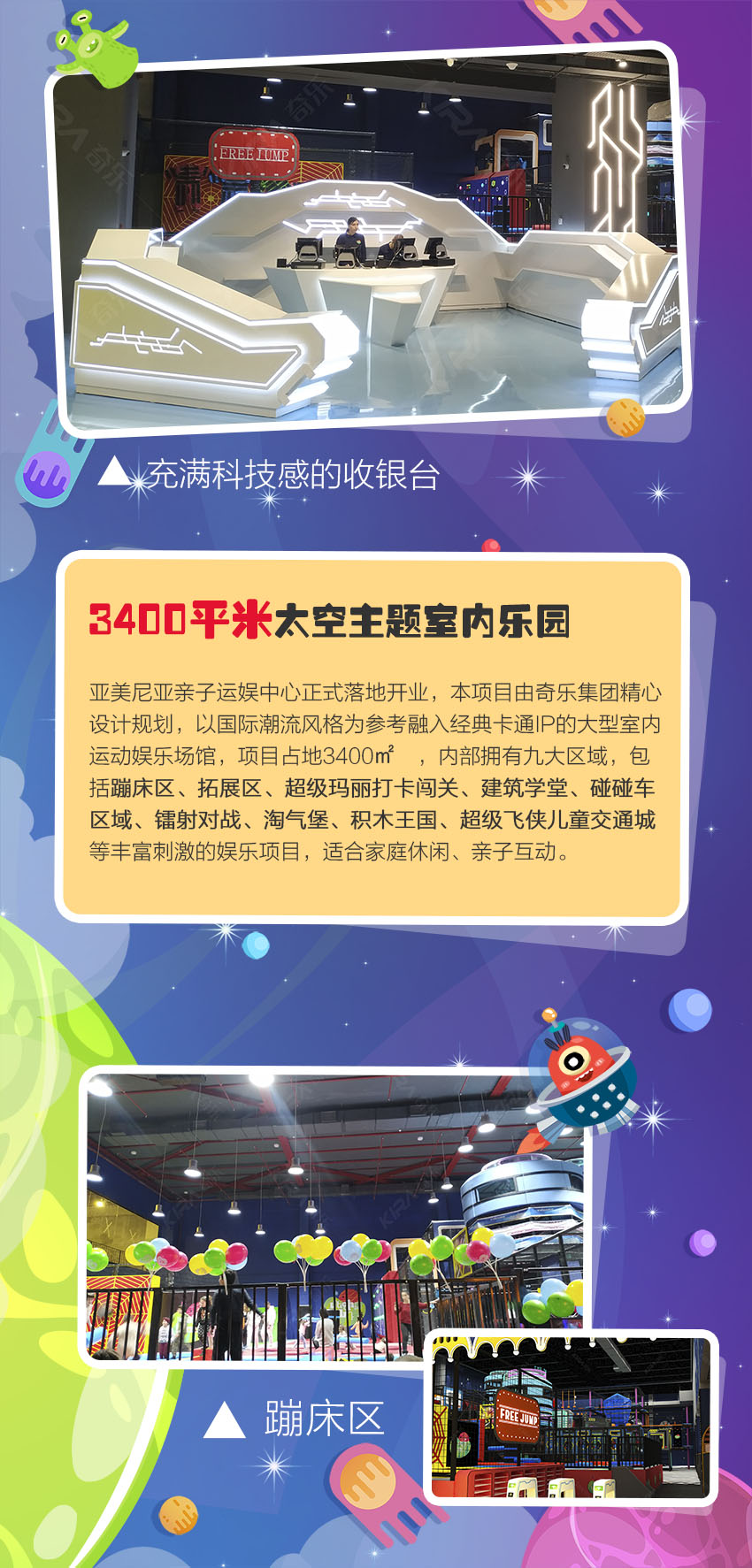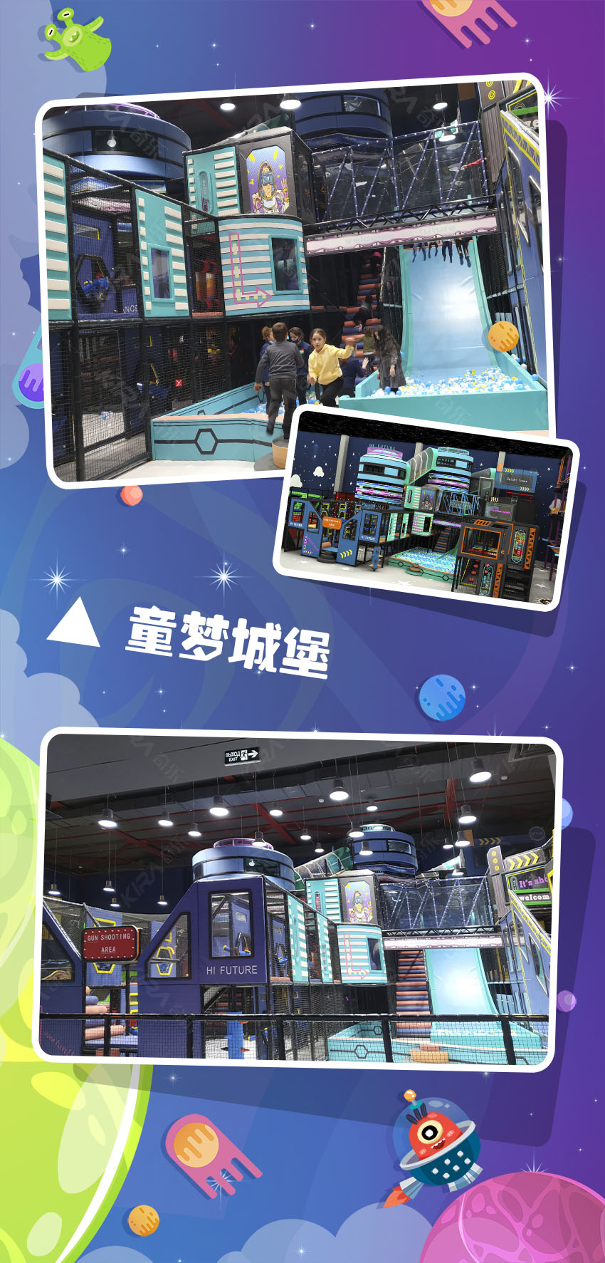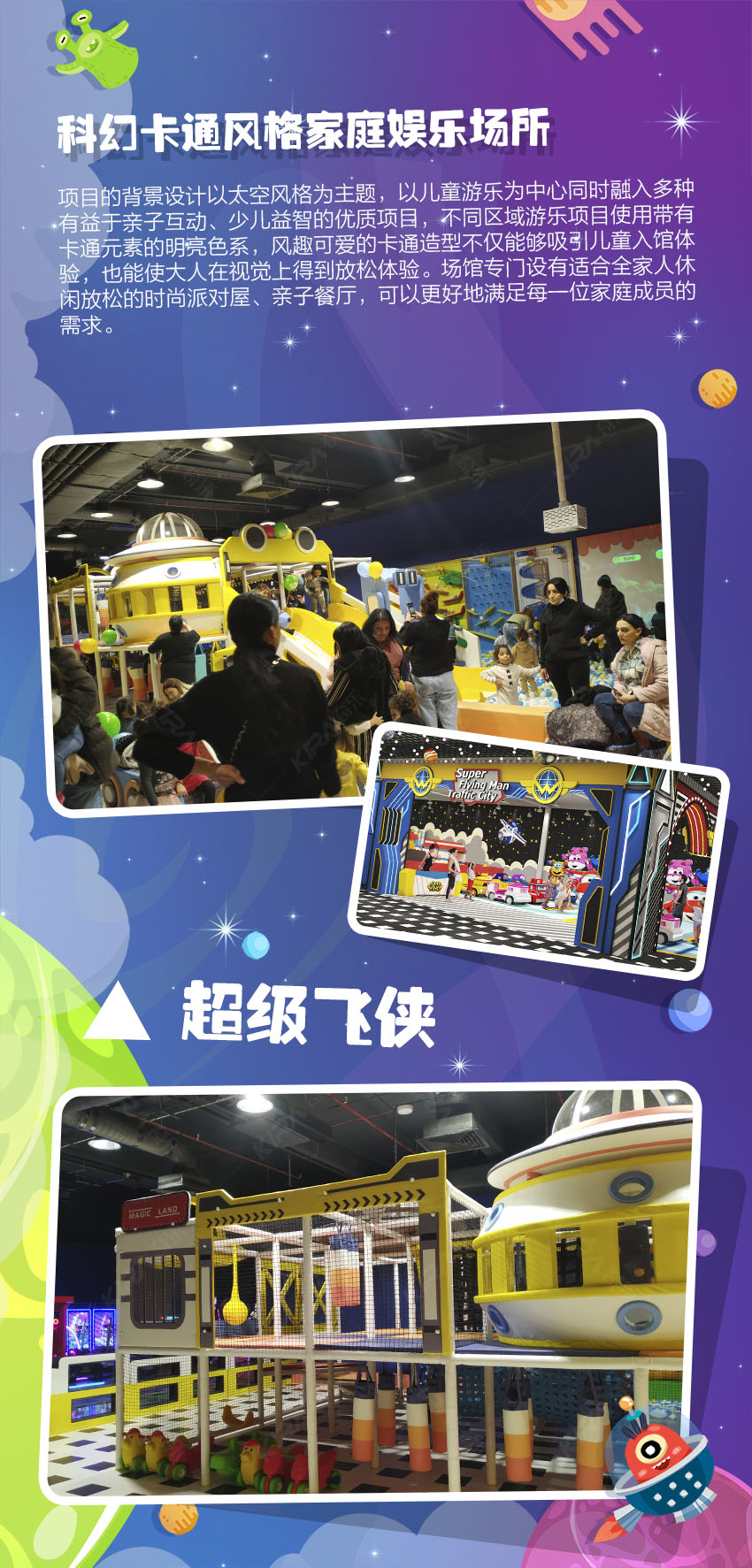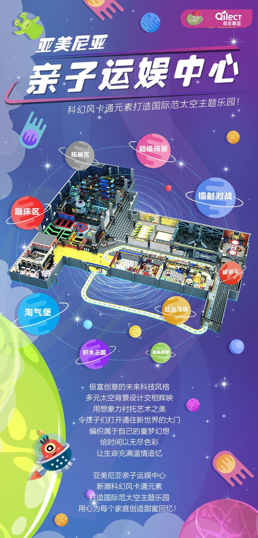 極富創(chuàng)意的未來科技風(fēng)格,多元太空背景設(shè)計交相輝映。用想象力襯托藝術(shù)之美,令孩子們打開通往新世界的大門,編織屬于自己的童夢幻想。給時間以無盡色彩,讓生命充滿溫情追憶! 亞美尼亞親子運娛中心,新潮科幻風(fēng)卡通元素,打造國際范太空主題樂園,用心為每個家庭創(chuàng)造甜蜜回憶!