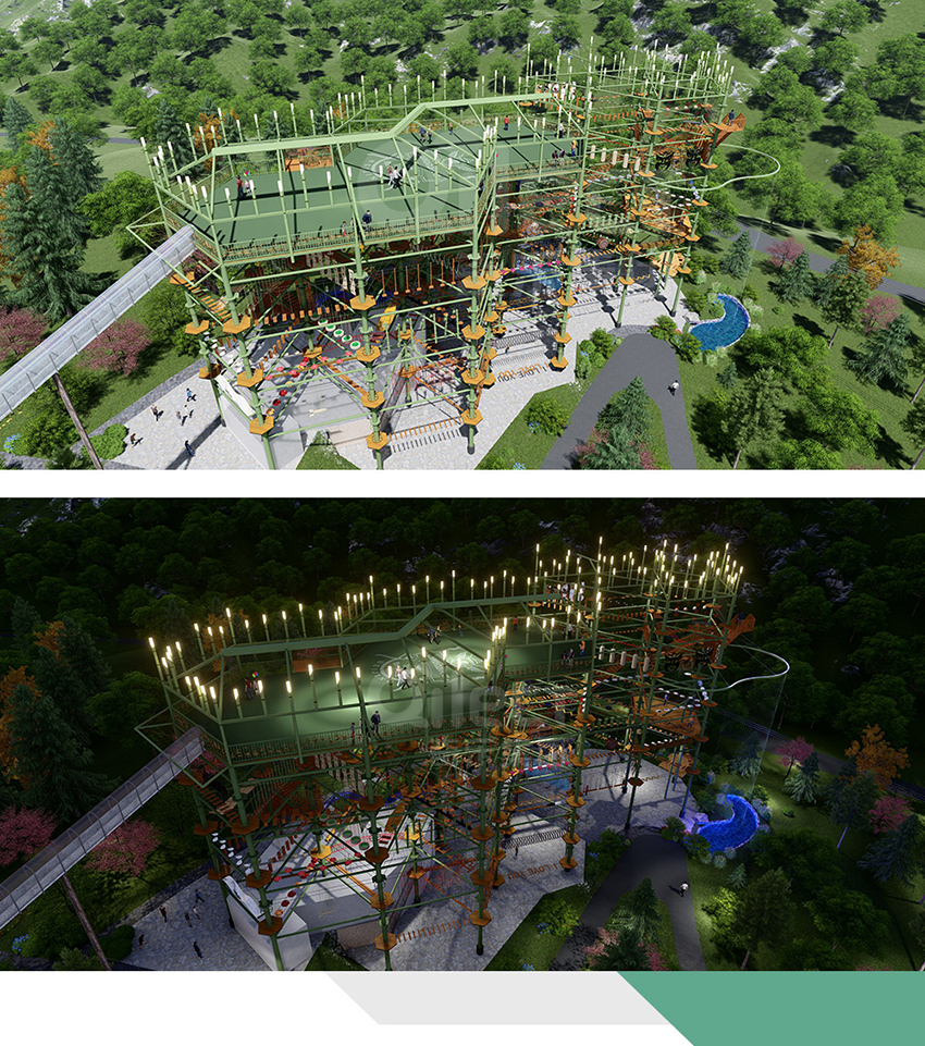 項目整體地形為階梯地形,在造型上因地制宜的巧妙引用當(dāng)?shù)販赜芎庸珗@喬木林?jǐn)?shù)萬棵大樹,給人一種四季皆美的“林海畫卷”的美感,頂部運用“蘆葦”造型的燈飾點綴,燈飾照明設(shè)備使用密集林立的太陽能環(huán)保節(jié)能燈桿,在夜間矗立山頂猶如繁星灑落構(gòu)成璀璨夜景極具視覺藝術(shù)感。