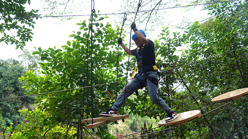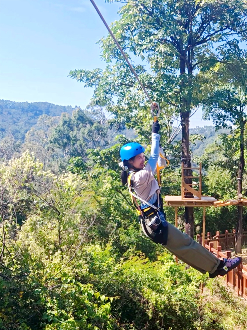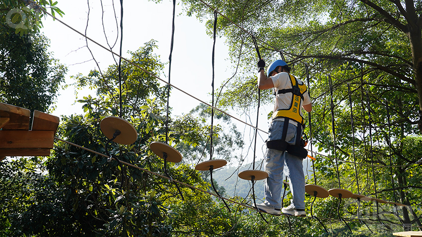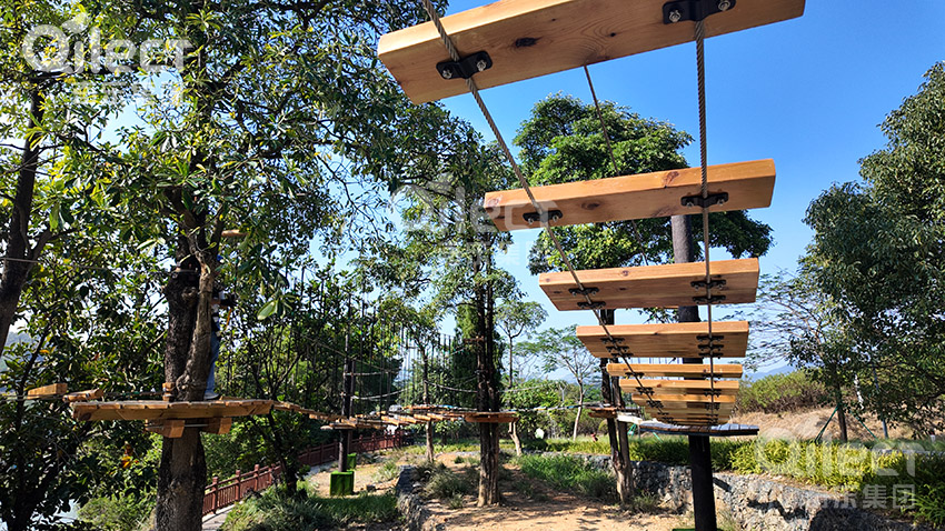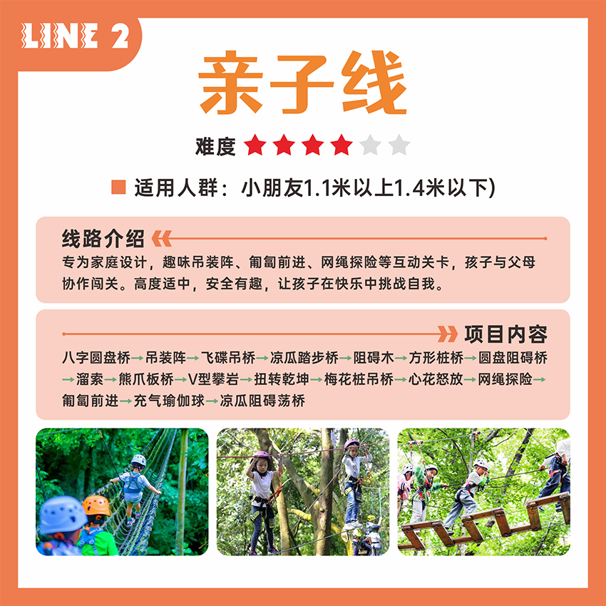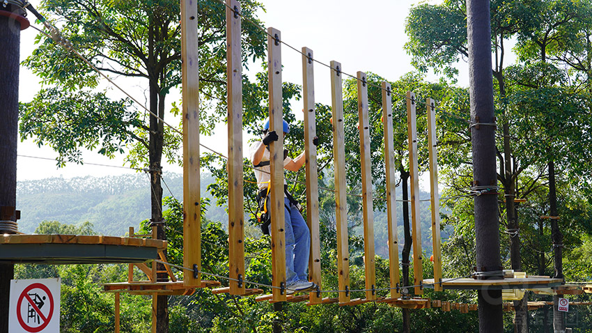 作為入門級(jí)線路,體驗(yàn)線高度適中,環(huán)節(jié)設(shè)置溫和有趣。包含短距離的獨(dú)木橋、蘑菇橋和交叉秋千橋等。它旨在幫助游客,尤其是孩子們,消除恐高心理,建立自信,初步掌握平衡與協(xié)調(diào)能力。
