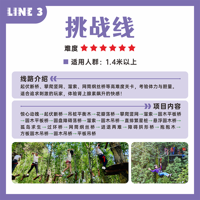 專為勇敢者準(zhǔn)備的進(jìn)階之路!挑戰(zhàn)線擁有更高的平臺(tái)、更長(zhǎng)的滑索和更復(fù)雜的障礙組合,如連續(xù)高空吊樁、Z字形平衡木、溜索、進(jìn)退兩難等。每一步都在考驗(yàn)?zāi)愕捏w力、耐力和心理素質(zhì)。