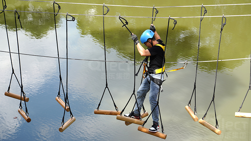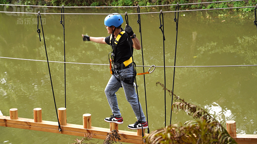 將叢林穿越與水元素結(jié)合!穿梭于樹冠之間,架設(shè)于田園水系之上,游客在水面上穿越,體驗(yàn)“水上輕功”的獨(dú)特樂(lè)趣。