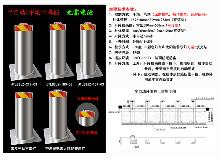 1.、半自動升降柱主要由不銹鋼升降柱、外桶保護(hù)裝置、底座等組成.