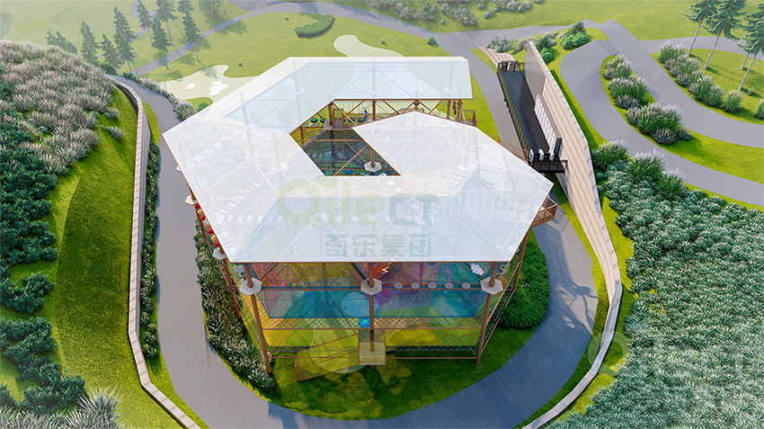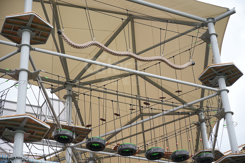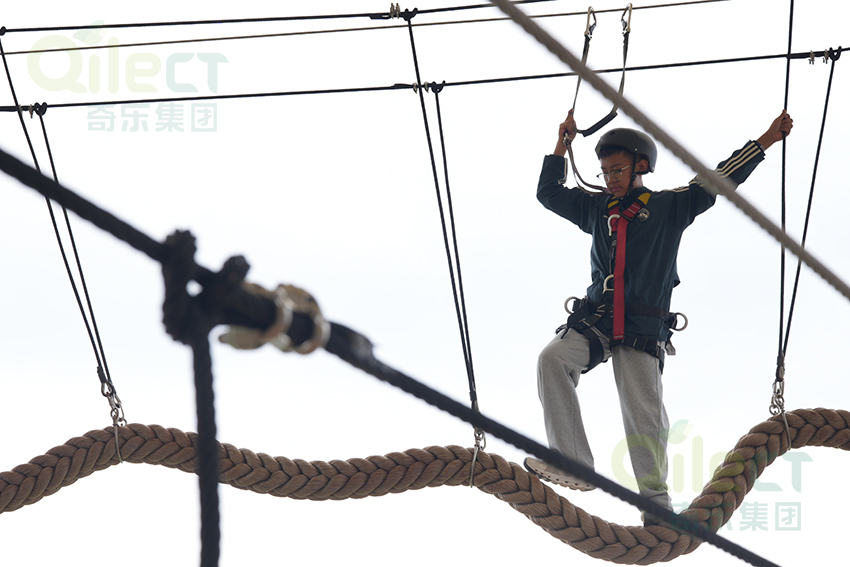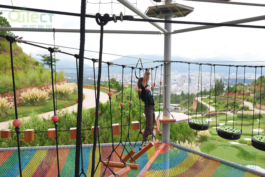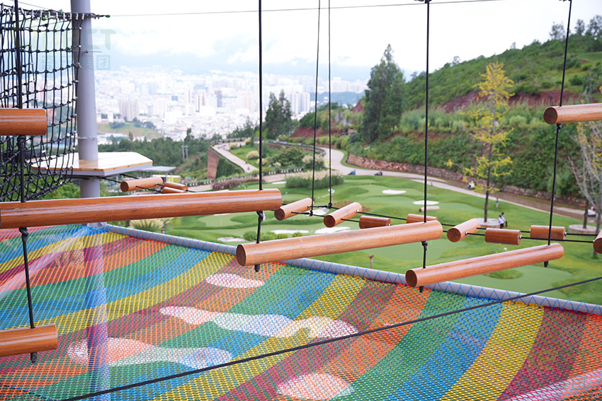 二層設計為一個繩網體驗層+16個拓展步道,輕極限體驗,挑戰難度適中,可以讓挑戰者更好的適應,先培養信心,以便完成更高一層的挑戰。