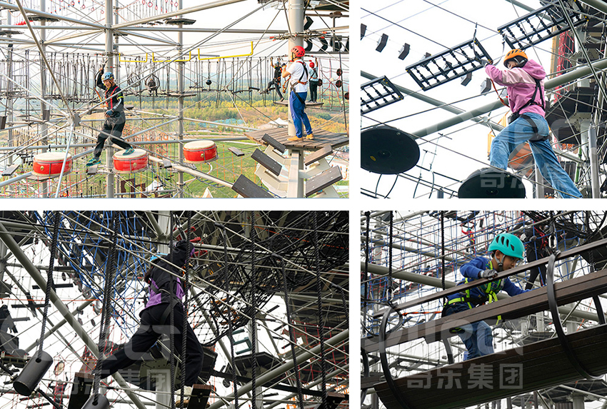 奇樂以游客體驗、文化體驗方面出發(fā),團建社交、極限運動及周末休閑等功能點來創(chuàng)新開發(fā)匯集拓展、探險、滑道、滑索、蹦極、攀巖、爬網(wǎng)、高空秋千等218種不同的運動體驗項目。關(guān)卡式挑戰(zhàn)的設(shè)計,難易分區(qū),每個人都能在這里找到適合自己的挑戰(zhàn)項目。