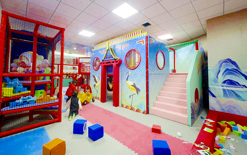 低齡幼兒區(1-3歲):設置在場地內側安靜區域,全軟包封閉設計,配備迷你滑梯、軟體積木和感官墻