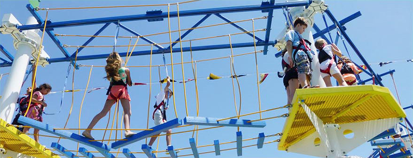 拓展支架:整體可拆裝、可移動,無現場焊接,鋼架體全部法蘭連接,設有2層斜梯,器材在整體上有足夠的強度,無明顯的擺動、永久變形及損壞現象,項目承載用鋼絲繩全部采用丙綸外層鋼絲繩,此繩具有鋼絲繩的安全強度還具有游樂器材的安全防護標準,采用當今世界最先進的鋼絲繩壓制金屬接頭工藝連接和靜音軌道,多向通行,增大載客量。