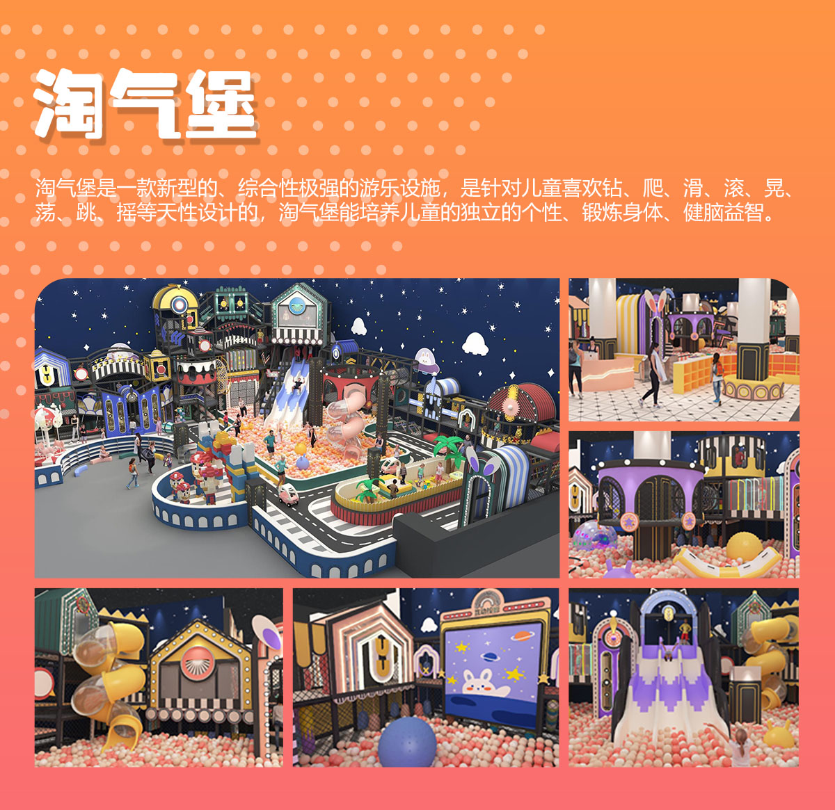 奇樂兒童樂園是包含淘氣堡、親子娛樂中心、彈跳迷宮、攀爬拓展、海洋球池等項目在內的一體化游樂設施。它有別于傳統的單一游樂設施,相比而言奇樂兒童樂園在項目上更加的豐富,在結構布局上更加的合理,在安全性穩定性上更有保障,在收益渠道上更加廣闊,是目前兒童樂園項目的主流。